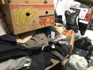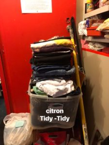 自身で持ち歩くカートにたくさんの身の回り品をつけて